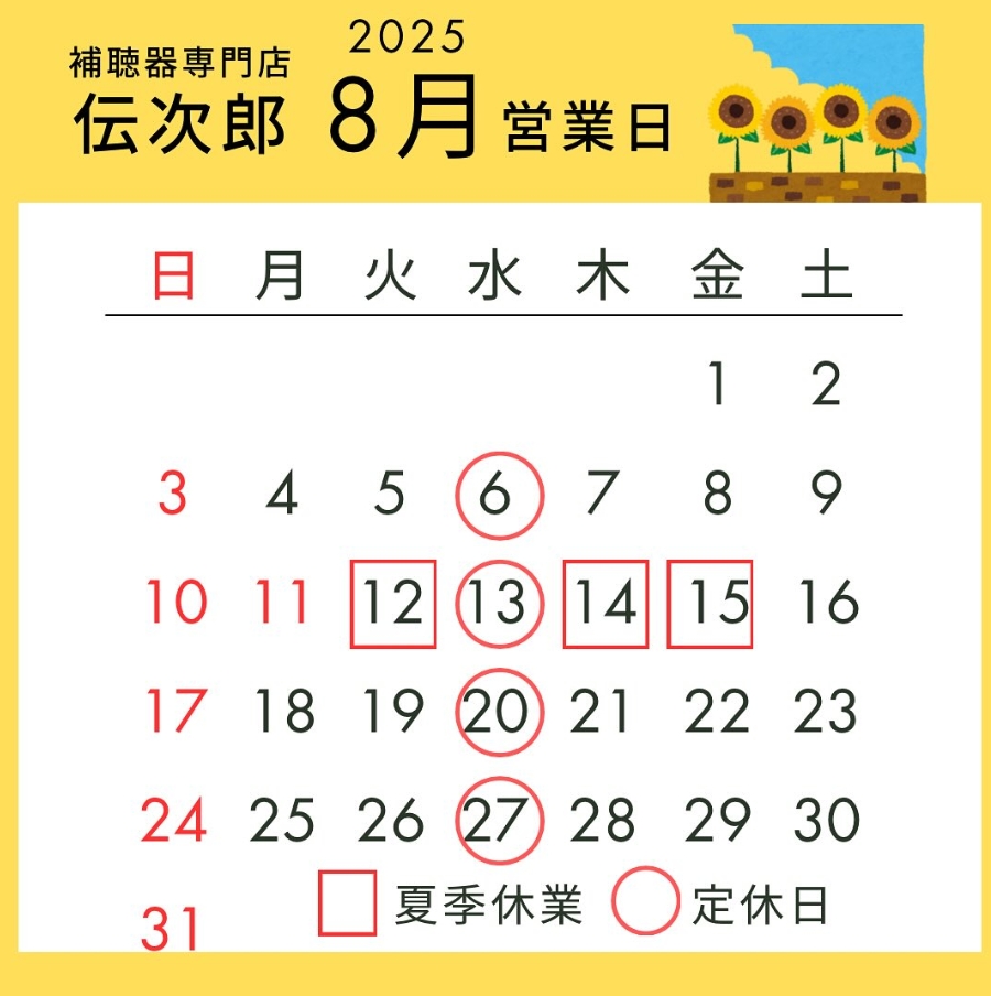認定補聴器専門店 認定補聴器技能者 補聴器専門店 伝次郎 2025年8月店休日🌻