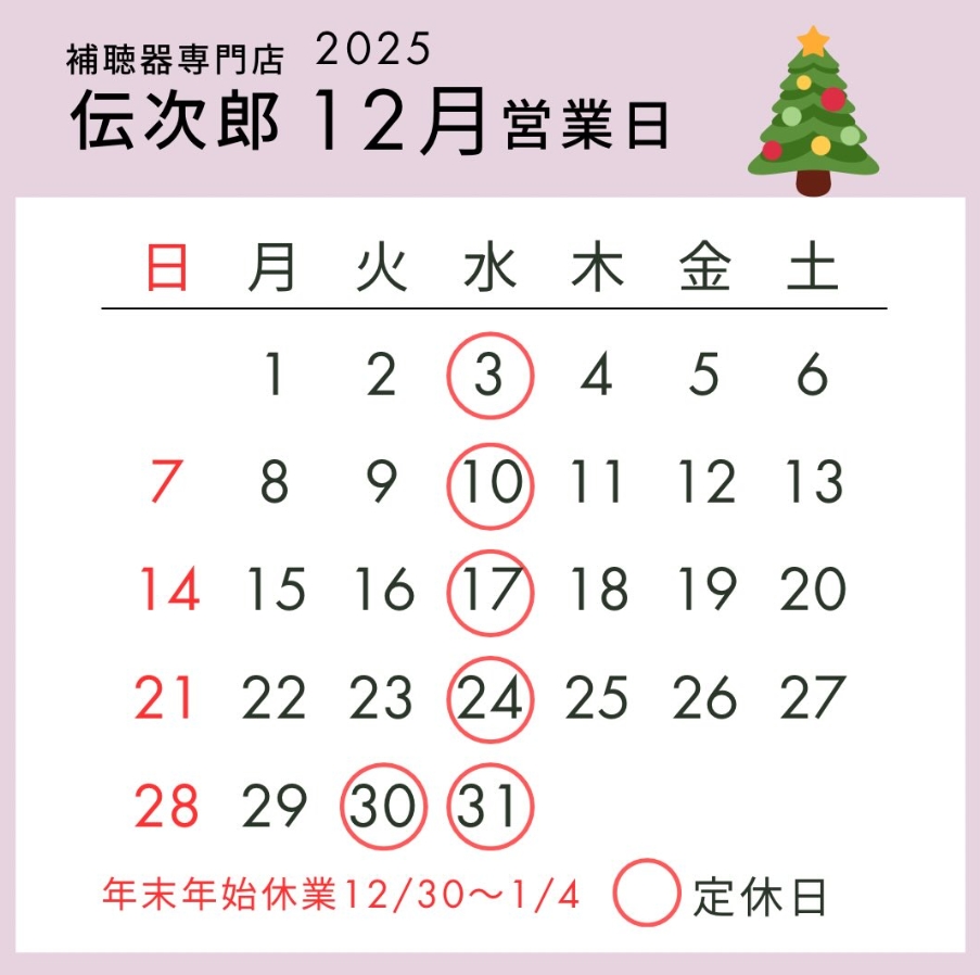 認定補聴器専門店 認定補聴器技能者 補聴器専門店 伝次郎 2025年12月店休日🎄