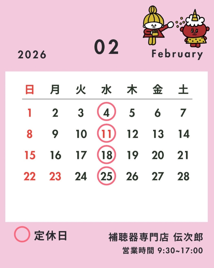 認定補聴器専門店 認定補聴器技能者 補聴器専門店 伝次郎 2026年2月店休日 投稿者: dennjioru33 投稿日: 2026年2月1日 • ( コメントする ) カテゴリー:お知らせ dennjioru33